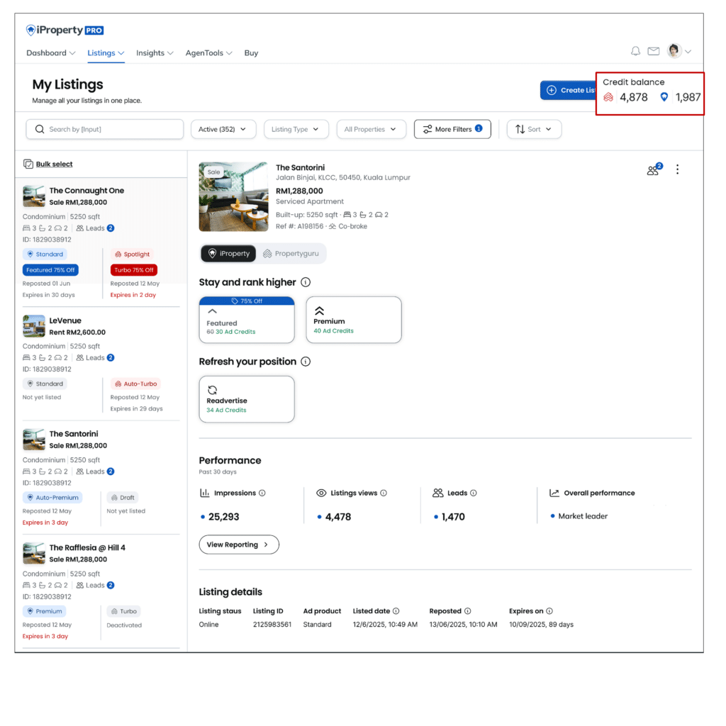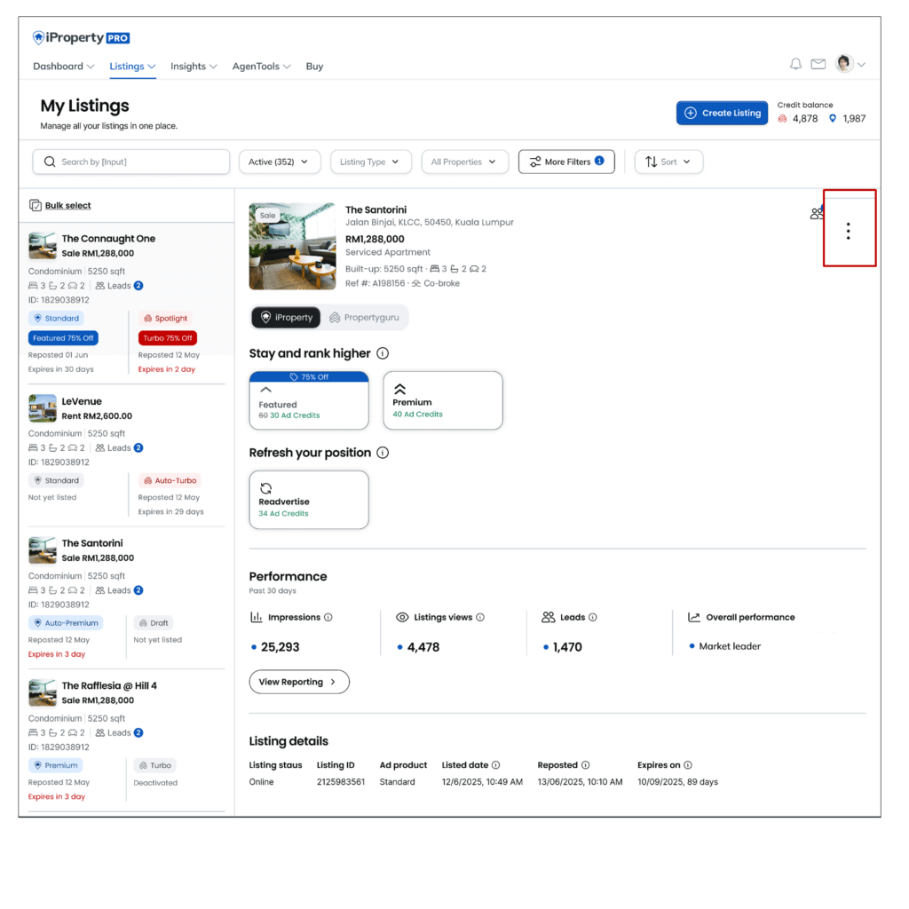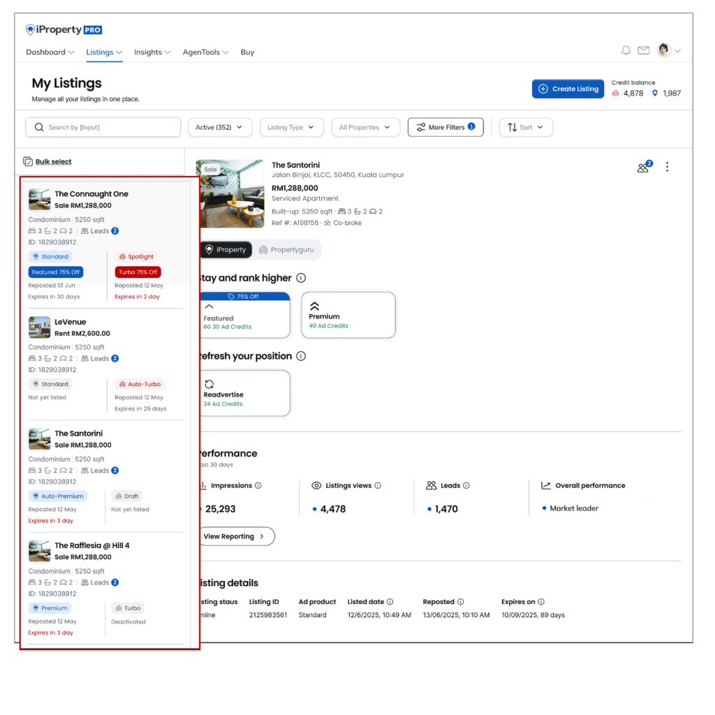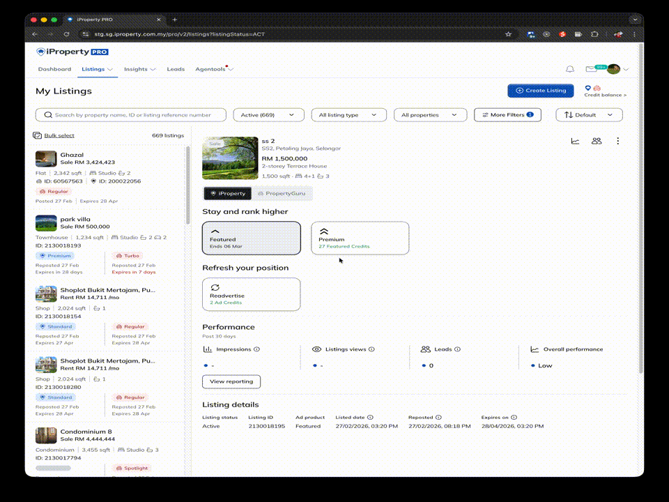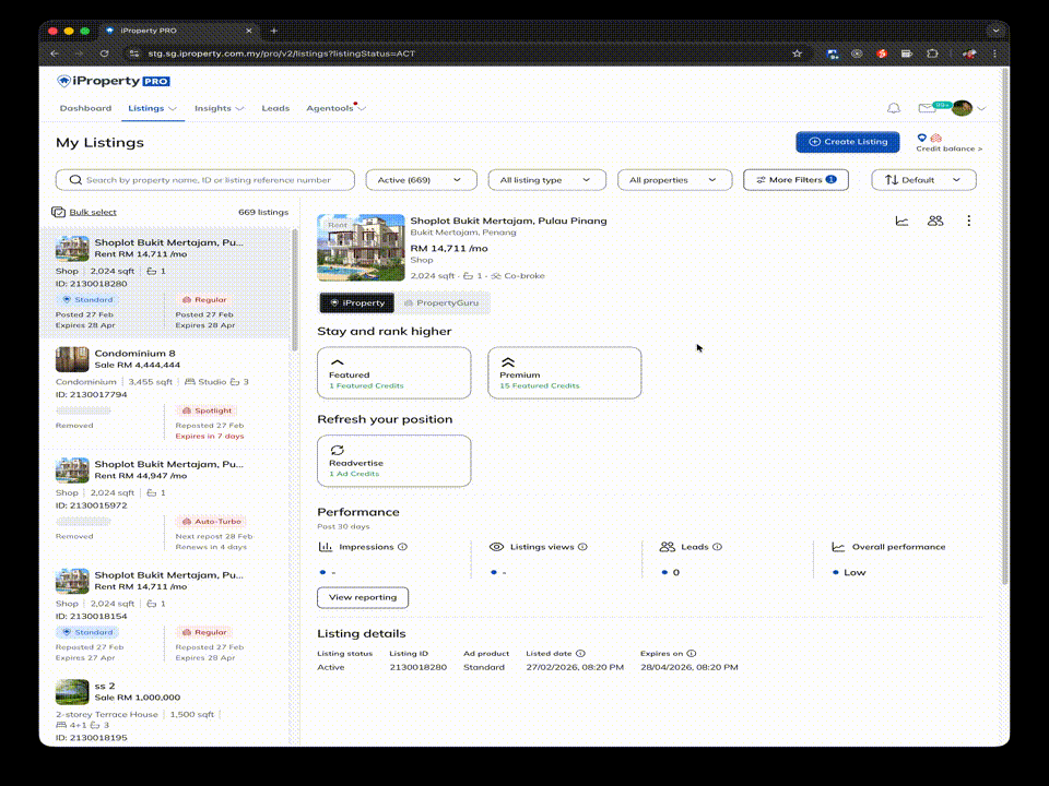 Updated Listing Management introduces a refreshed layout that provides a consistent Listing Management experience for agents using iProperty PRO and AgentNet (PropertyGuru). This update focuses on improving clarity and ease of use. While the layout has been refreshed, existing features remain unchanged.